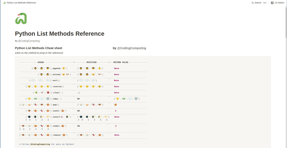 Python List Methods Cheatsheet + Reference document